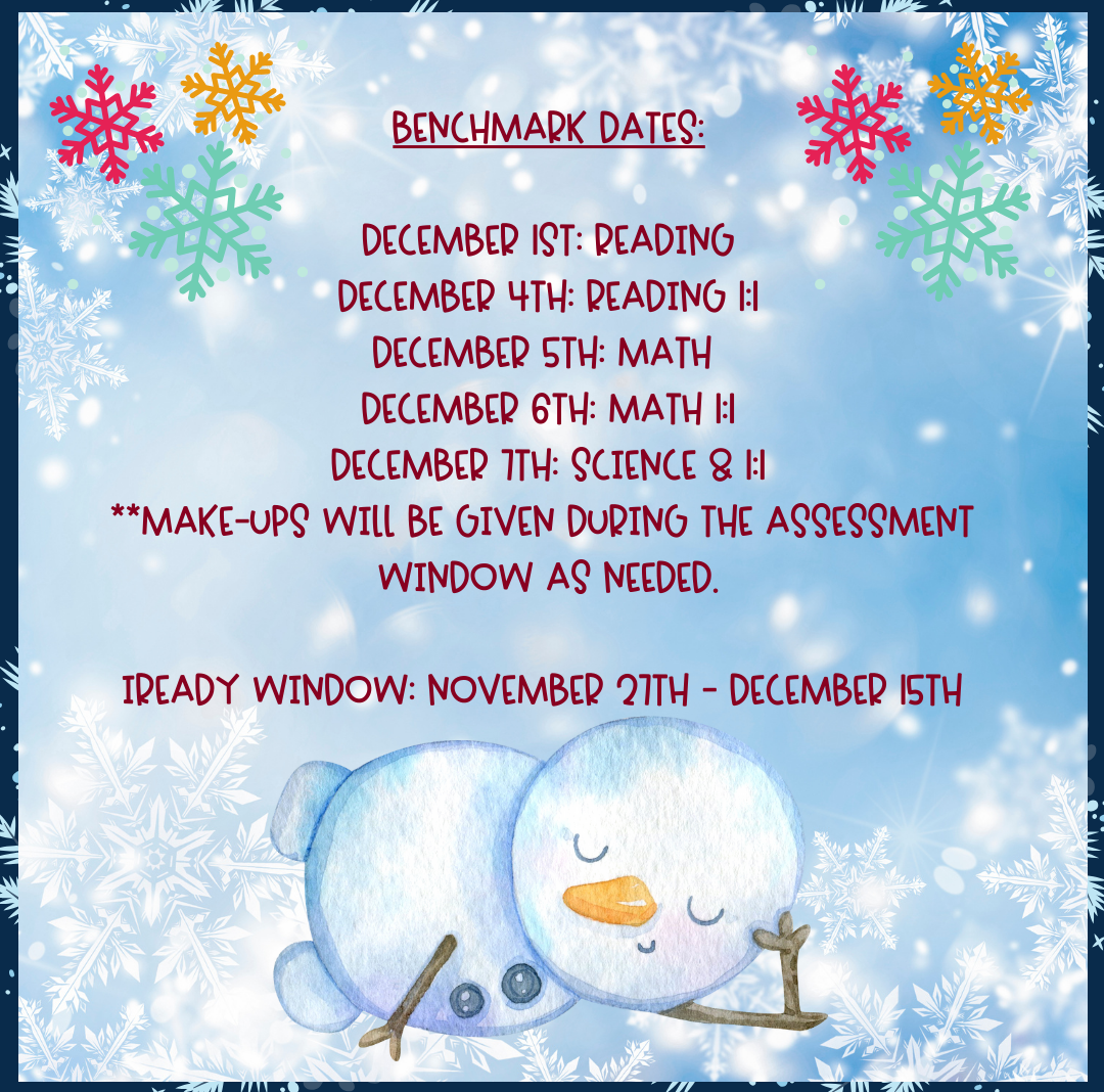 Our second benchmark window is approaching, students will take their benchmarks in December. Please see the schedule below. Students will need to come to school on time with a charged device. Please be sure they eat a healthy breakfast and get good rest so they can do their best!